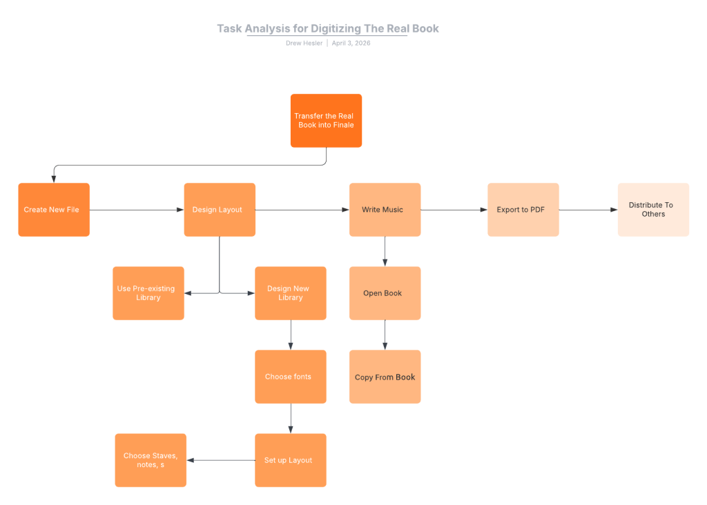 For analysis of the user data I had collected, I believed that a task analysis was appropriate to discover what users needed from any successor to finale. For the task analysis, the task that I selected was the process of digitizing the Real Book in Finale, which is an unofficial collection of jazz standards written on lead sheets that was published by a group of college students in the 1960s. This was meant to be shared and bootlegged, distributed freely across thousands of musicians.