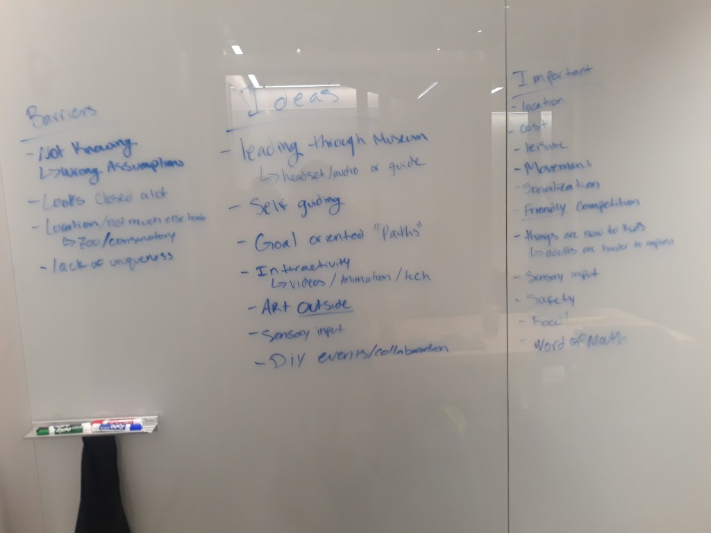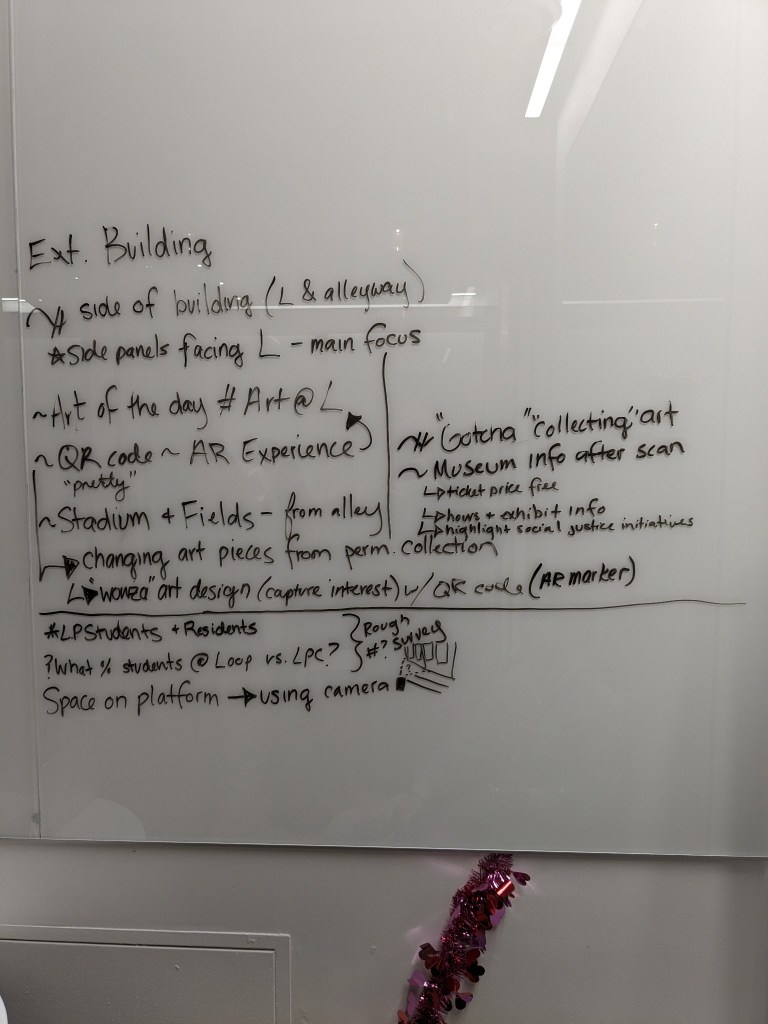 The first part of coming up with our designs was to take the research we had done and aggregate it into a couple different areas of research. The class had convened into groups and developed questions based on the research we had collected. I can’t quite remember what the questions were and I missed half of class due to an incident involving a shortage of ADHD medication, but this eventually coalesced into five or so areas wherein solutions could be focused: the DPAM exterior, takeaways, remote experiences, on-site games, and outreach. I decided to be part of the team that focused upon the DPAM exterior.