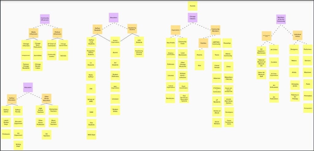 When we first visited the DePaul Art Museum, I was struck by how much of an underdog situation that we were dealing with. The DPAM has a collection of over 4,000 items; small, but still significant. In terms of mapping stakeholders, the process was a simple brainstorming session. Just come up with people who might be interested in the museum, indirectly or directly.