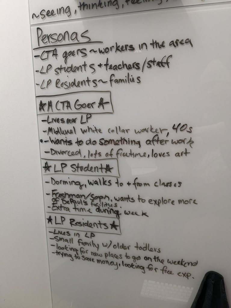 After brainstorming a bit, we came up with a rough draft of the personas who would eventually become the personas involved. These people were a Depaul Student, a Lincoln Park Resident, and a CTA Rider.